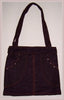 Handtasche mit Henkel aus schwarzem Jeansstoff im Stil einer Jeanshose genäht. Vorne zwei schmale, schräge Taschen, mit Nieten verziert. Die Tasche ist mit einem kleinen Klettverschluss verschliessbar.